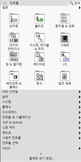 컨트롤 팔레트는 프런트패널에서 마우스 우클릭을 하면 펼쳐지는 팔레트입니다. 블록다이어그램에서 함수들을 활용하여 알고리즘을 전개할 때에 우리는 입출력이 필요합니다. 이러한 입력(컨트롤)과 출력(인디케이터)를 생성할 수 있는 팔레트입니다. 숫자형, 불리언, 문자열, 경로, 배열, 행렬, 클러스터, 리스트, 테이블, 트리, 그래프, 이미지, 링, 열거형, 탭 뿐만 아니라 단순히 UI를 꾸미기 위한 다양한 도형들도 컨트롤 팔레트에서 찾아서 사용할 수 있습니다. 펼쳐진 컨트롤 팔레트의 가장 상단에 보이는 컨트롤/인디케이터 모음은 '일반' 버전의 입출력입니다. 풀다운 되어 있는 아래쪽의 실버, 시스템, 클래식 탭을 클릭해 보면 좀 더 다양한 색깔과 느낌의 컨트롤/인디케이터를 제공합니다. 저는 개인적으로 UI를 꾸미는 데에는 시스템, 버튼은 실버를 많이 사용합니다. 그냥 깔끔하고 예쁘니까요! 개인적으로 클래식이나 일반은 너무 투박한 느낌이 듭니다.
