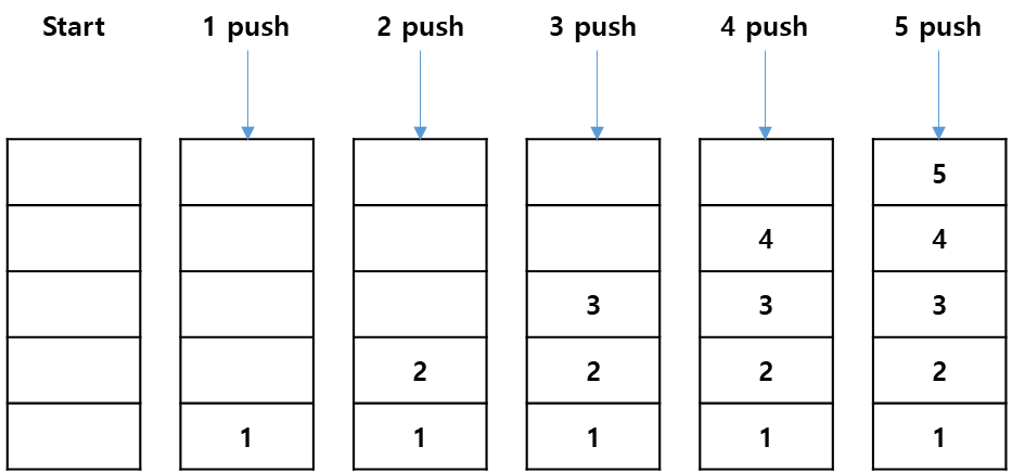 - 스택에 데이터를 저장하는 것을 푸시(push), 데이터를 추출하는 것을 팝(pop)이라고 한다.